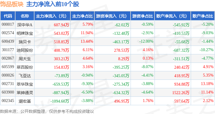 从资金流向上来看,当日饰品板块主力资金净流出1.26亿元,游资资金净流出268.81万元,散户资金净流入1.29亿元。饰品板块个股资金流向见下表: