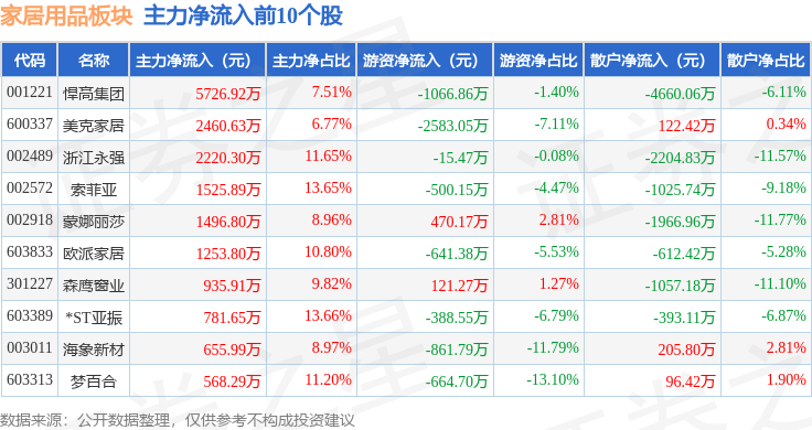 从资金流向上来看,当日家居用品板块主力资金净流出1.05亿元,游资资金净流出8172.43万元,散户资金净流入1.87亿元。家居用品板块个股资金流向见下表: