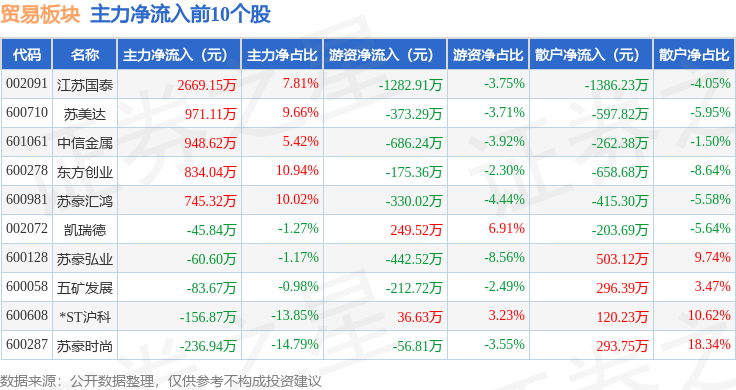 从资金流向上来看,当日贸易板块主力资金净流入1834.26万元,游资资金净流出1738.7万元,散户资金净流出95.55万元。贸易板块个股资金流向见下表: