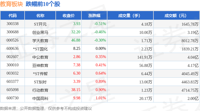 证券之星消息,9月24日教育板块较上一交易日下跌1.7%,ST开元领跌。当日上证指数报收于3853.64,上涨0.83%。深证成指报收于13356.14,上涨1.8%。教育板块个股涨跌见下表: