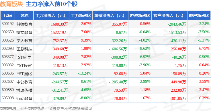 从资金流向上来看,当日教育板块主力资金净流出4038.05万元,游资资金净流出73.61万元,散户资金净流入4111.66万元。教育板块个股资金流向见下表: