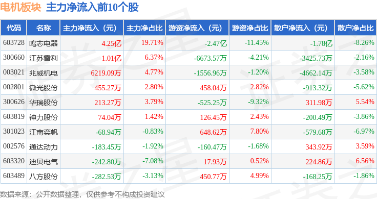 从资金流向上来看,当日电机板块主力资金净流出11.75亿元,游资资金净流入1.15亿元,散户资金净流入10.59亿元。电机板块个股资金流向见下表: