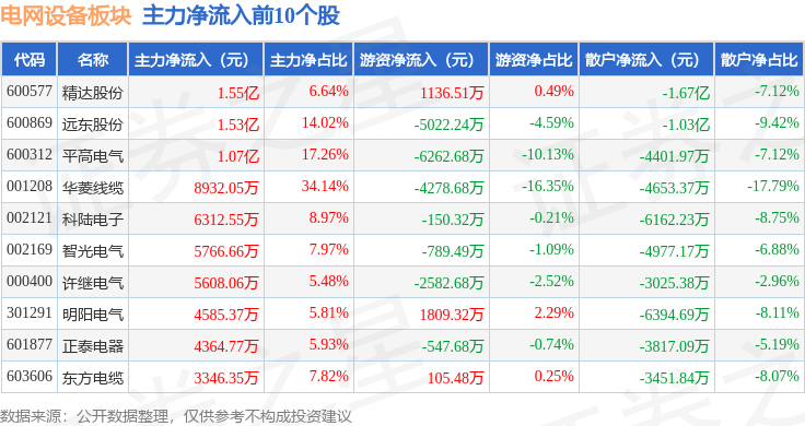 从资金流向上来看,当日电网设备板块主力资金净流出5.21亿元,游资资金净流出3.86亿元,散户资金净流入9.07亿元。电网设备板块个股资金流向见下表: