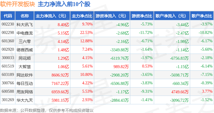 从资金流向上来看,当日软件开发板块主力资金净流入10.65亿元,游资资金净流出19.35亿元,散户资金净流入8.7亿元。软件开发板块个股资金流向见下表: