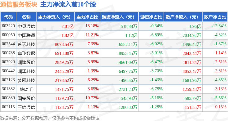 从资金流向上来看,当日通信服务板块主力资金净流出912.32万元,游资资金净流出3.91亿元,散户资金净流入4.01亿元。通信服务板块个股资金流向见下表: