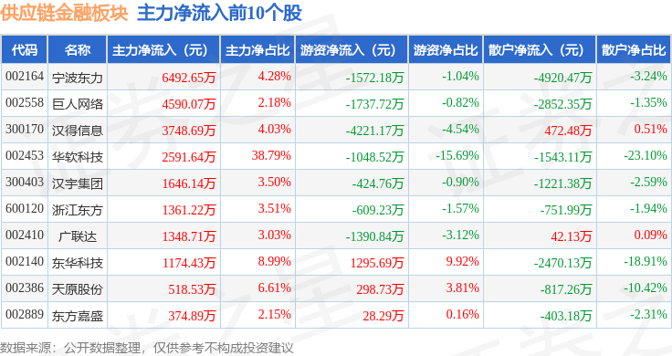 从资金流向上来看,当日供应链金融板块主力资金净流出5.86亿元,游资资金净流入5752.25万元,散户资金净流入5.28亿元。供应链金融板块个股资金流向见下表: