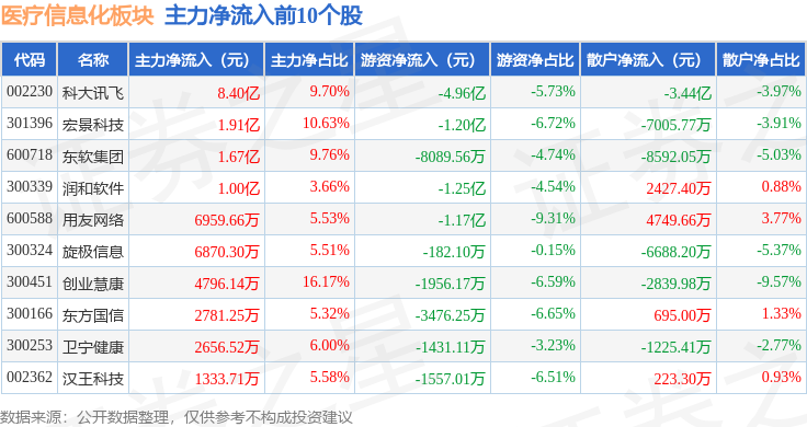 从资金流向上来看,当日医疗信息化板块主力资金净流入8.17亿元,游资资金净流出13.54亿元,散户资金净流入5.36亿元。医疗信息化板块个股资金流向见下表: