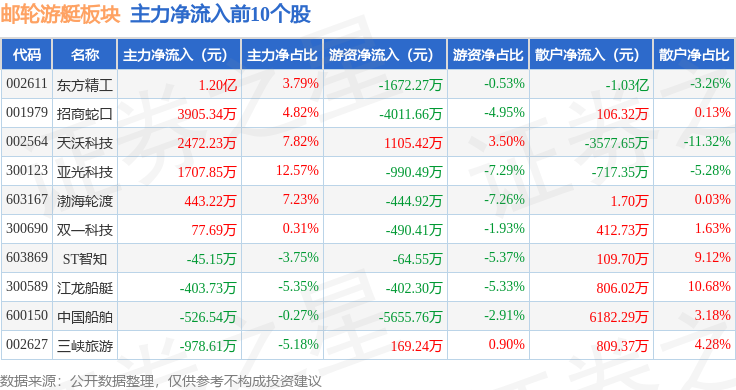 从资金流向上来看,当日邮轮游艇板块主力资金净流出1.27亿元,游资资金净流出1.72亿元,散户资金净流入3.0亿元。邮轮游艇板块个股资金流向见下表: