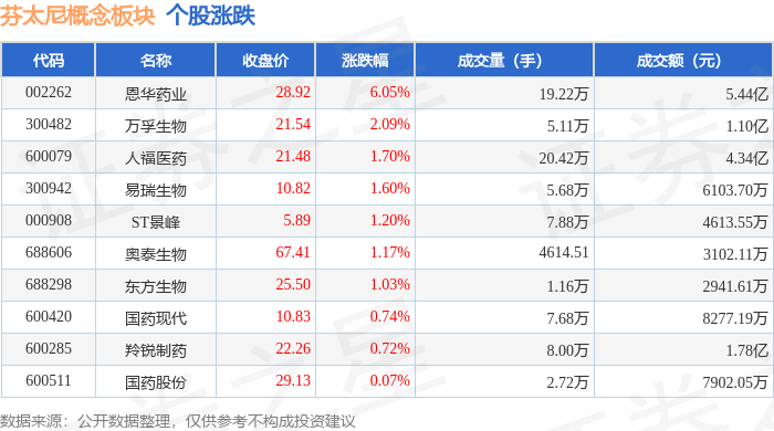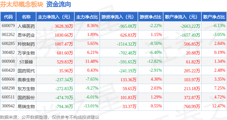 从资金流向上来看,当日芬太尼概念板块主力资金净流入5134.6万元,游资资金净流出3059.68万元,散户资金净流出2074.92万元。芬太尼概念板块个股资金流向见下表: