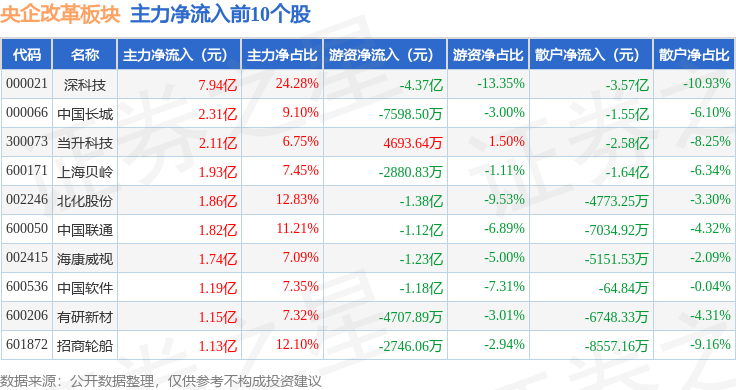 从资金流向上来看,当日央企改革板块主力资金净流入6.89亿元,游资资金净流出17.7亿元,散户资金净流入10.81亿元。央企改革板块个股资金流向见下表: