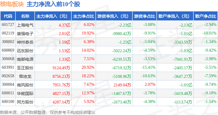 从资金流向上来看,当日核电板块主力资金净流出29.43亿元,游资资金净流出1.12亿元,散户资金净流入30.55亿元。核电板块个股资金流向见下表: