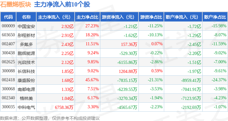 从资金流向上来看,当日石墨烯板块主力资金净流入9.46亿元,游资资金净流出5.09亿元,散户资金净流出4.37亿元。石墨烯板块个股资金流向见下表: