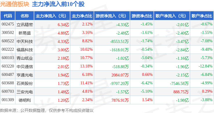 从资金流向上来看,当日光通信板块主力资金净流出21.0亿元,游资资金净流出1.33亿元,散户资金净流入22.33亿元。光通信板块个股资金流向见下表: