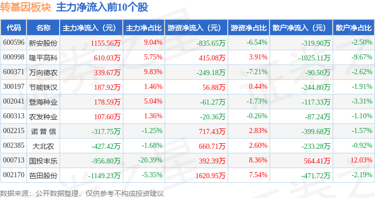 从资金流向上来看,当日转基因板块主力资金净流出2542.82万元,游资资金净流入3352.02万元,散户资金净流出809.2万元。转基因板块个股资金流向见下表: