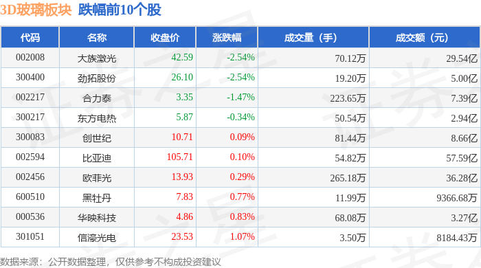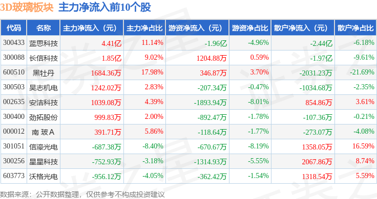 从资金流向上来看,当日3D玻璃板块主力资金净流出8.47亿元,游资资金净流出5815.26万元,散户资金净流入9.05亿元。3D玻璃板块个股资金流向见下表: