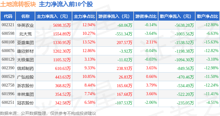 从资金流向上来看,当日土地流转板块主力资金净流出1.88亿元,游资资金净流入9272.78万元,散户资金净流入9509.3万元。土地流转板块个股资金流向见下表: