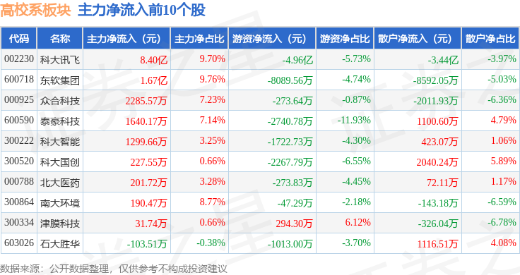 从资金流向上来看,当日高校系板块主力资金净流入8.09亿元,游资资金净流出6.03亿元,散户资金净流出2.06亿元。高校系板块个股资金流向见下表: