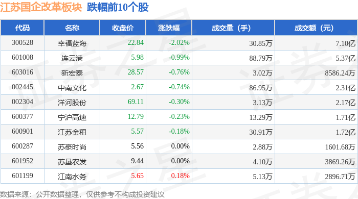 证券之星消息,9月24日江苏国企改革板块较上一交易日上涨0.36%,南 京 港领涨。当日上证指数报收于3853.64,上涨0.83%。深证成指报收于13356.14,上涨1.8%。江苏国企改革板块个股涨跌见下表: