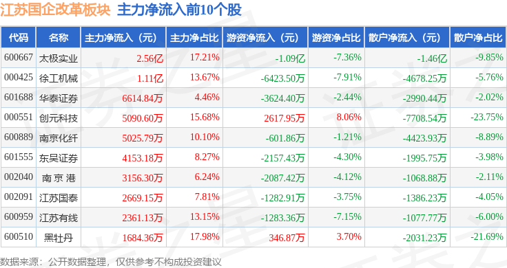 从资金流向上来看,当日江苏国企改革板块主力资金净流入4.8亿元,游资资金净流出3.11亿元,散户资金净流出1.7亿元。江苏国企改革板块个股资金流向见下表: