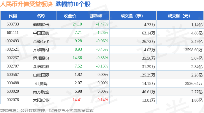 证券之星消息,9月24日人民币升值受益板块较上一交易日下跌1.35%,仙鹤股份领跌。当日上证指数报收于3853.64,上涨0.83%。深证成指报收于13356.14,上涨1.8%。人民币升值受益板块个股涨跌见下表: