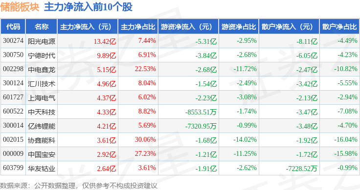 从资金流向上来看,当日储能板块主力资金净流入19.23亿元,游资资金净流出20.57亿元,散户资金净流入1.33亿元。储能板块个股资金流向见下表: