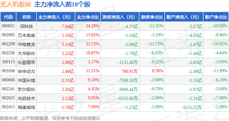 从资金流向上来看,当日无人机板块主力资金净流入28.39亿元,游资资金净流出20.81亿元,散户资金净流出7.58亿元。无人机板块个股资金流向见下表: