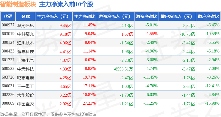 从资金流向上来看,当日智能制造板块主力资金净流入19.6亿元,游资资金净流出46.1亿元,散户资金净流入26.5亿元。智能制造板块个股资金流向见下表: