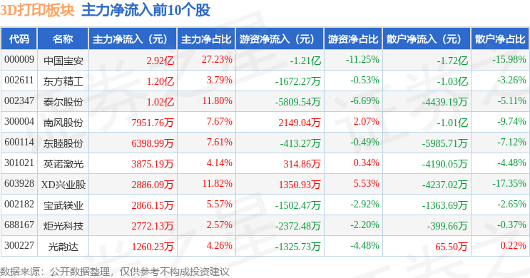 从资金流向上来看,当日3D打印板块主力资金净流入1363.3万元,游资资金净流出2.48亿元,散户资金净流入2.35亿元。3D打印板块个股资金流向见下表: