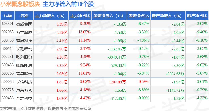 从资金流向上来看,当日小米概念股板块主力资金净流出20.47亿元,游资资金净流出9.58亿元,散户资金净流入30.05亿元。小米概念股板块个股资金流向见下表: