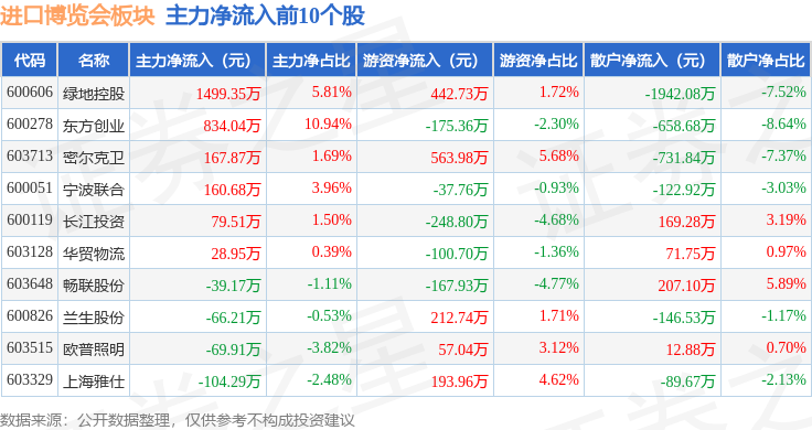 从资金流向上来看,当日进口博览会板块主力资金净流入1053.59万元,游资资金净流入269.67万元,散户资金净流出1323.26万元。进口博览会板块个股资金流向见下表: