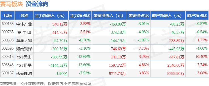 从资金流向上来看,当日赛马板块主力资金净流出2.32亿元,游资资金净流入1.12亿元,散户资金净流入1.2亿元。赛马板块个股资金流向见下表: