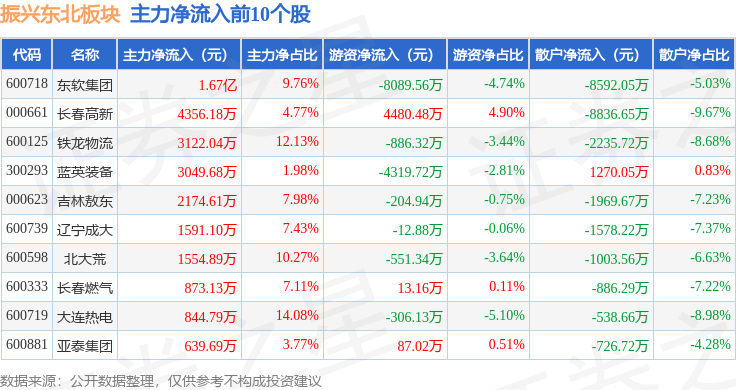 从资金流向上来看,当日振兴东北板块主力资金净流入5785.79万元,游资资金净流出4368.38万元,散户资金净流出1417.41万元。振兴东北板块个股资金流向见下表: