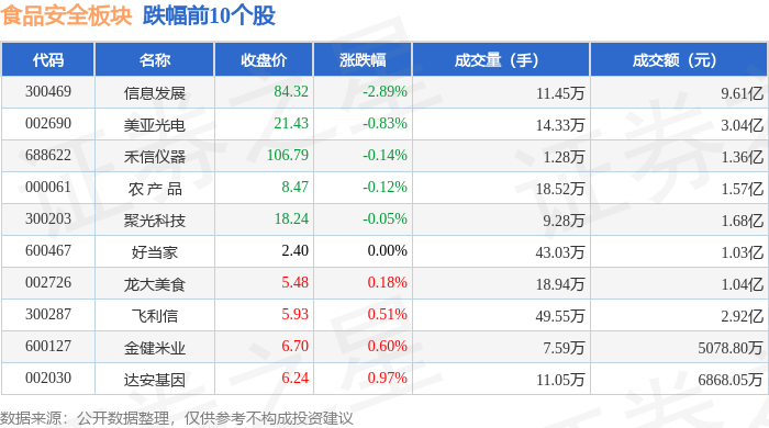证券之星消息,9月24日食品安全板块较上一交易日下跌0.14%,信息发展领跌。当日上证指数报收于3853.64,上涨0.83%。深证成指报收于13356.14,上涨1.8%。食品安全板块个股涨跌见下表: