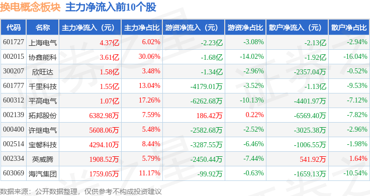 从资金流向上来看,当日换电概念板块主力资金净流入8.58亿元,游资资金净流出6.53亿元,散户资金净流出2.05亿元。换电概念板块个股资金流向见下表: