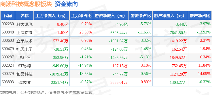 从资金流向上来看,当日商汤科技概念股板块主力资金净流入9.38亿元,游资资金净流出5.58亿元,散户资金净流出3.8亿元。商汤科技概念股板块个股资金流向见下表: