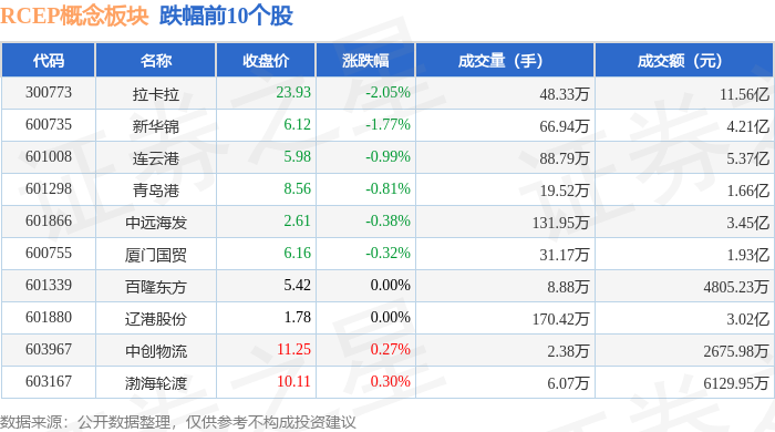 证券之星消息,9月24日RCEP概念板块较上一交易日下跌0.37%,拉卡拉领跌。当日上证指数报收于3853.64,上涨0.83%。深证成指报收于13356.14,上涨1.8%。RCEP概念板块个股涨跌见下表: