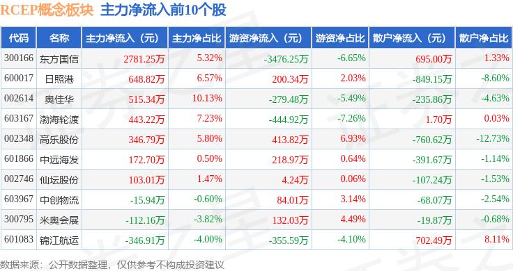 从资金流向上来看,当日RCEP概念板块主力资金净流出3.64亿元,游资资金净流入7710.89万元,散户资金净流入2.86亿元。RCEP概念板块个股资金流向见下表: