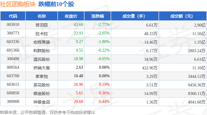 证券之星消息,9月24日社区团购板块较上一交易日下跌1.04%,若羽臣领跌。当日上证指数报收于3853.64,上涨0.83%。深证成指报收于13356.14,上涨1.8%。社区团购板块个股涨跌见下表: