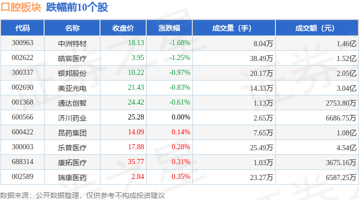 从资金流向上来看,当日口腔板块主力资金净流入2.75亿元,游资资金净流出2.01亿元,散户资金净流出7450.41万元。口腔板块个股资金流向见下表: