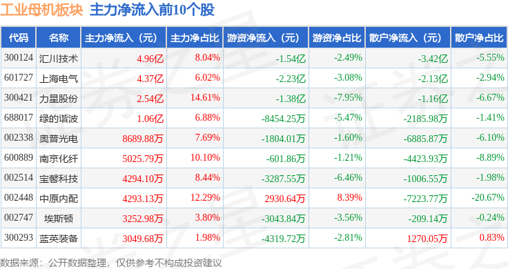 从资金流向上来看,当日工业母机板块主力资金净流入10.09亿元,游资资金净流出8.82亿元,散户资金净流出1.27亿元。工业母机板块个股资金流向见下表: