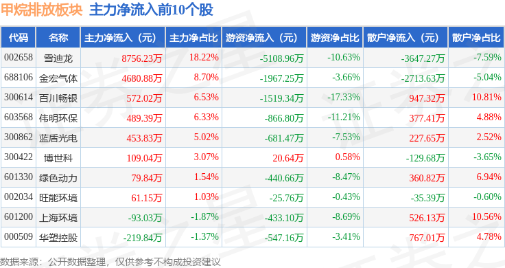 从资金流向上来看,当日甲烷排放板块主力资金净流入7248.49万元,游资资金净流出9376.24万元,散户资金净流入2127.75万元。甲烷排放板块个股资金流向见下表: