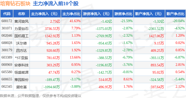 从资金流向上来看,当日培育钻石板块主力资金净流入2.09亿元,游资资金净流出2.24亿元,散户资金净流入1467.79万元。培育钻石板块个股资金流向见下表: