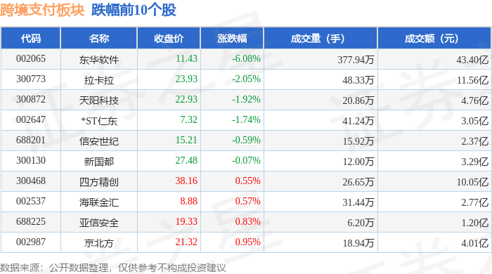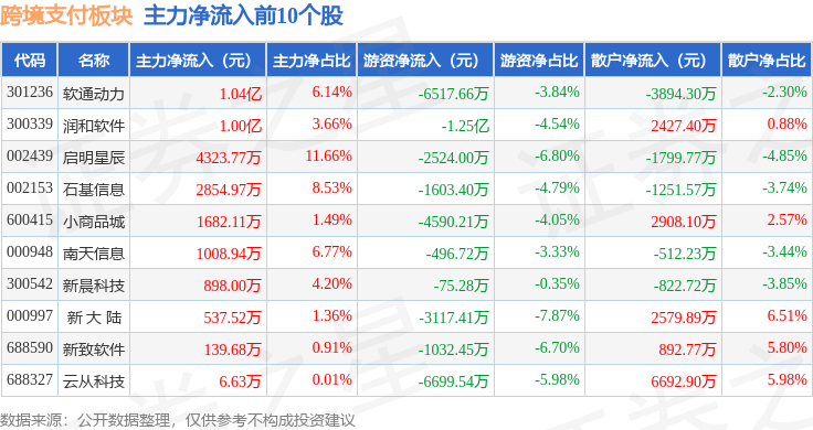 从资金流向上来看,当日跨境支付板块主力资金净流出7.61亿元,游资资金净流出6.22亿元,散户资金净流入13.83亿元。跨境支付板块个股资金流向见下表: