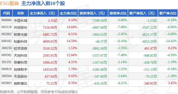 从资金流向上来看,当日F5G板块主力资金净流出7.87亿元,游资资金净流入3.96亿元,散户资金净流入3.91亿元。F5G板块个股资金流向见下表: