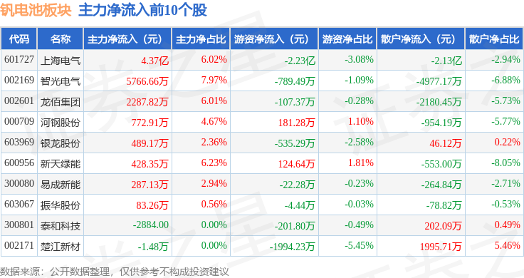 从资金流向上来看,当日钒电池板块主力资金净流入6685.78万元,游资资金净流出7212.64万元,散户资金净流入526.86万元。钒电池板块个股资金流向见下表: