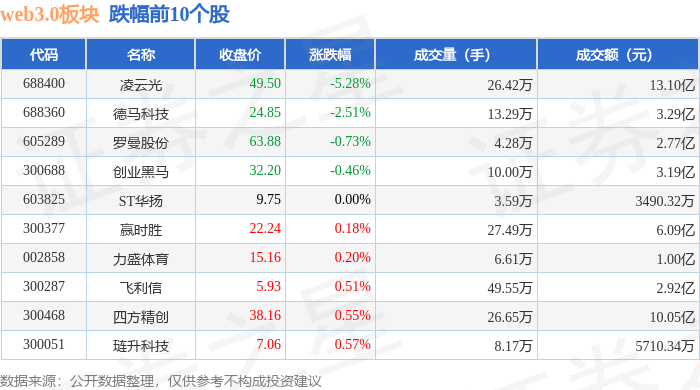 证券之星消息,9月24日web3.0板块较上一交易日下跌2.1%,凌云光领跌。当日上证指数报收于3853.64,上涨0.83%。深证成指报收于13356.14,上涨1.8%。web3.0板块个股涨跌见下表: