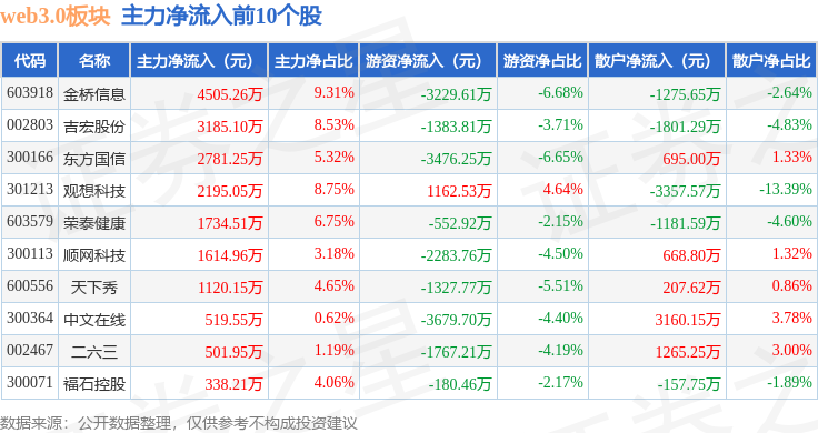 从资金流向上来看,当日web3.0板块主力资金净流出3.63亿元,游资资金净流出2.45亿元,散户资金净流入6.08亿元。web3.0板块个股资金流向见下表: