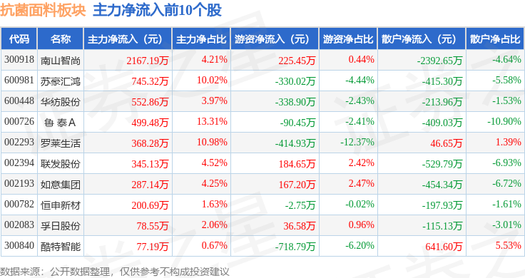 从资金流向上来看,当日抗菌面料板块主力资金净流出9993.15万元,游资资金净流出3042.65万元,散户资金净流入1.3亿元。抗菌面料板块个股资金流向见下表: