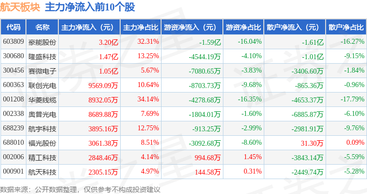 从资金流向上来看,当日航天板块主力资金净流出16.23亿元,游资资金净流出4232.31万元,散户资金净流入16.65亿元。航天板块个股资金流向见下表: