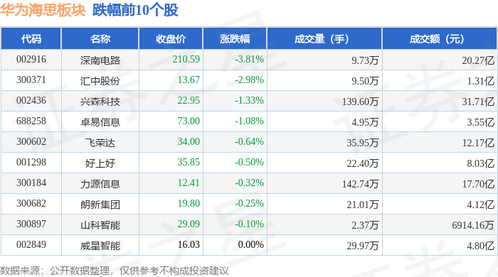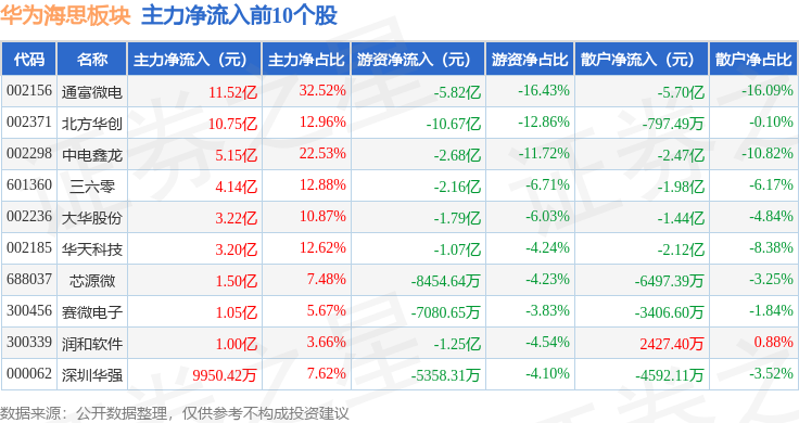 从资金流向上来看,当日华为海思板块主力资金净流入36.93亿元,游资资金净流出31.11亿元,散户资金净流出5.81亿元。华为海思板块个股资金流向见下表: